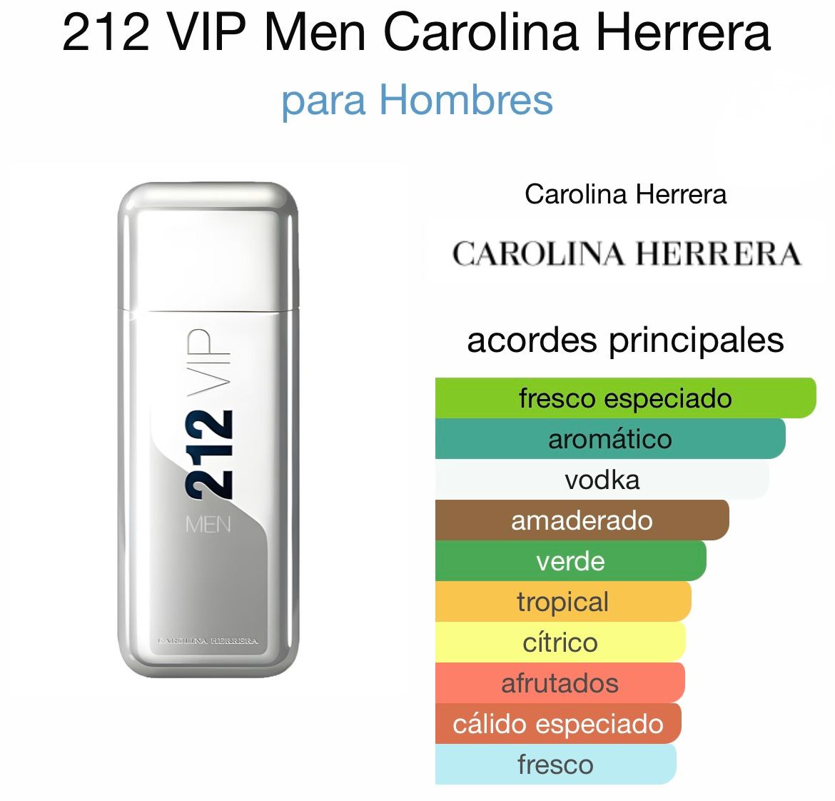 212 VIP Men de Carolina Herrera es una fragancia de la familia olfativa Oriental Amaderada para Hombres. 212 VIP Men se lanzó en 2011. 212 VIP Men fue creada por Emilie Coppermann y Lucas Sieuzac. Las Notas de Salida son maracuyá (fruta de la pasión), lima (limón verde), pimienta y jengibre; las Notas de Corazón son vodka, ginebra, menta y especias; las Notas de Fondo son ámbar, cuero y notas amaderadas.