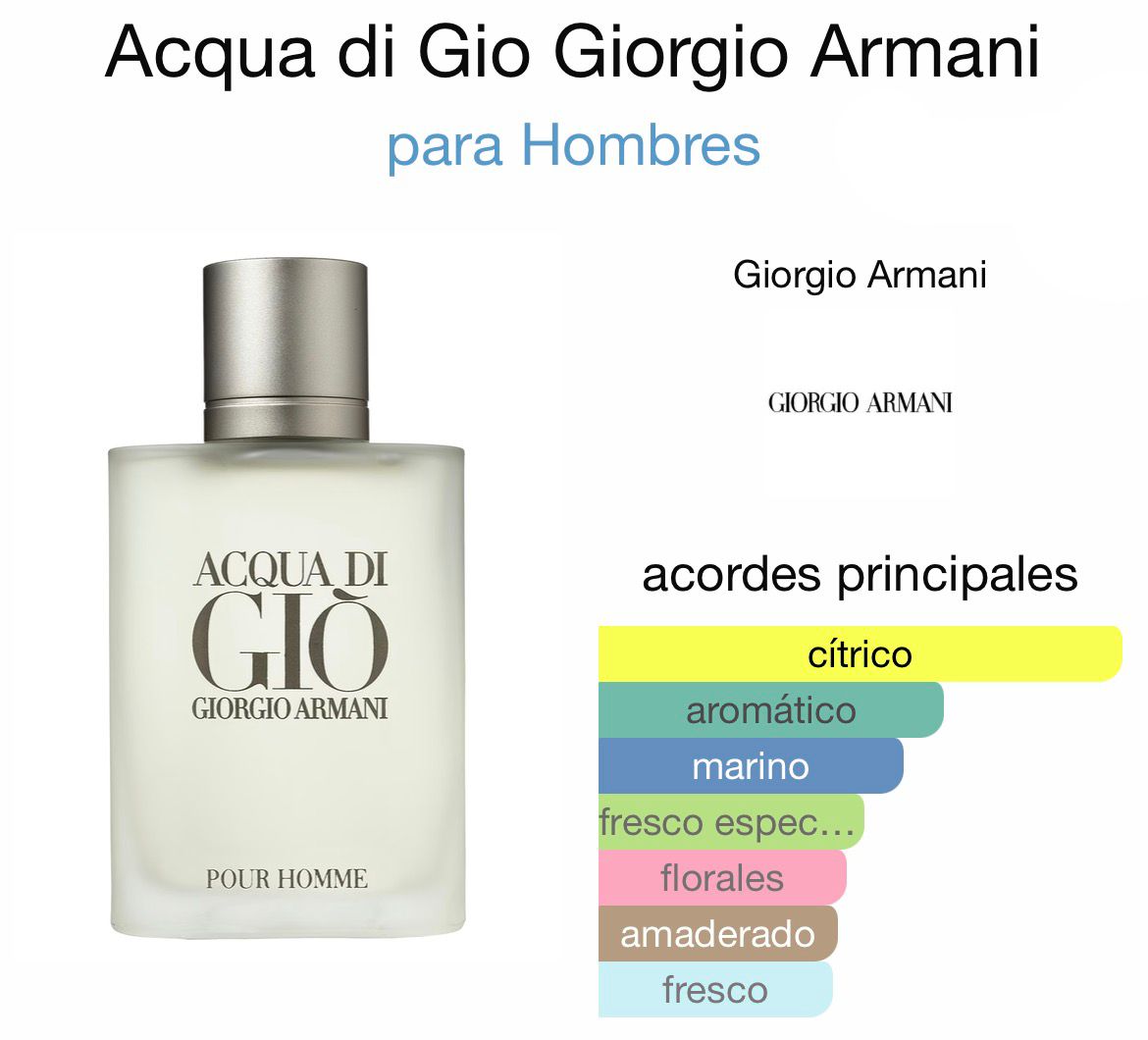 Acqua di Gio de Giorgio Armani es una fragancia de la familia olfativa Aromática Acuática para Hombres. Acqua di Gio se lanzó en 1996. Acqua di Gio fue creada por Alberto Morillas, Annick Menardo y Christian Dussoulier. Las Notas de Salida son lima (limón verde), limón (lima ácida), bergamota, jazmín, naranja, mandarina y neroli; las Notas de Corazón son notas marinas, jazmín, calone, romero, durazno (melocotón), fresia, jacinto, ciclamen (violeta persa), violeta, cilantro, rosa, nuez moscada y reseda (miñoneta); las Notas de Fondo son almizcle blanco, cedro, musgo de roble, pachulí y ámbar.