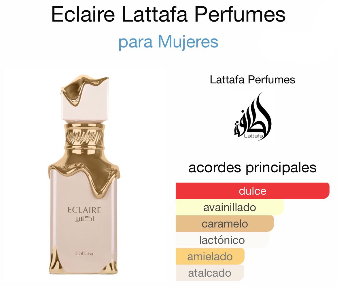 Eclaire de Lattafa Perfumes es una fragancia de la familia olfativa Floral Frutal Gourmand para Mujeres. Esta fragrancia es nueva. Eclaire se lanzó en 2024. Las Notas de Salida son caramelo, leche y azúcar; las Notas de Corazón son miel y flores blancas; las Notas de Fondo son vainilla, praliné y almizcle.