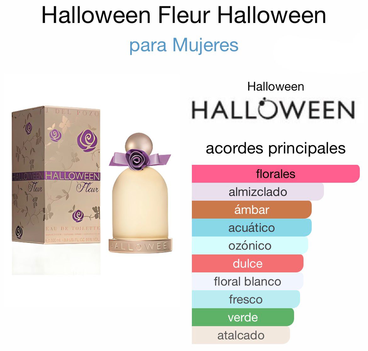 Halloween Fleur de Halloween es una fragancia de la familia olfativa Almizcle Floral Amaderado para Mujeres. Halloween Fleur se lanzó en 2013. Halloween Fleur fue creada por Carlos Benaïm, Nicolas Beaulieu y Olivier Polge. Las Notas de Salida son hojas de violeta, pera y mandarina; las Notas de Corazón son lila, jazmín sambac (sampaguita) y orquídea; las Notas de Fondo son madera de cachemira, almizcle y ámbar.