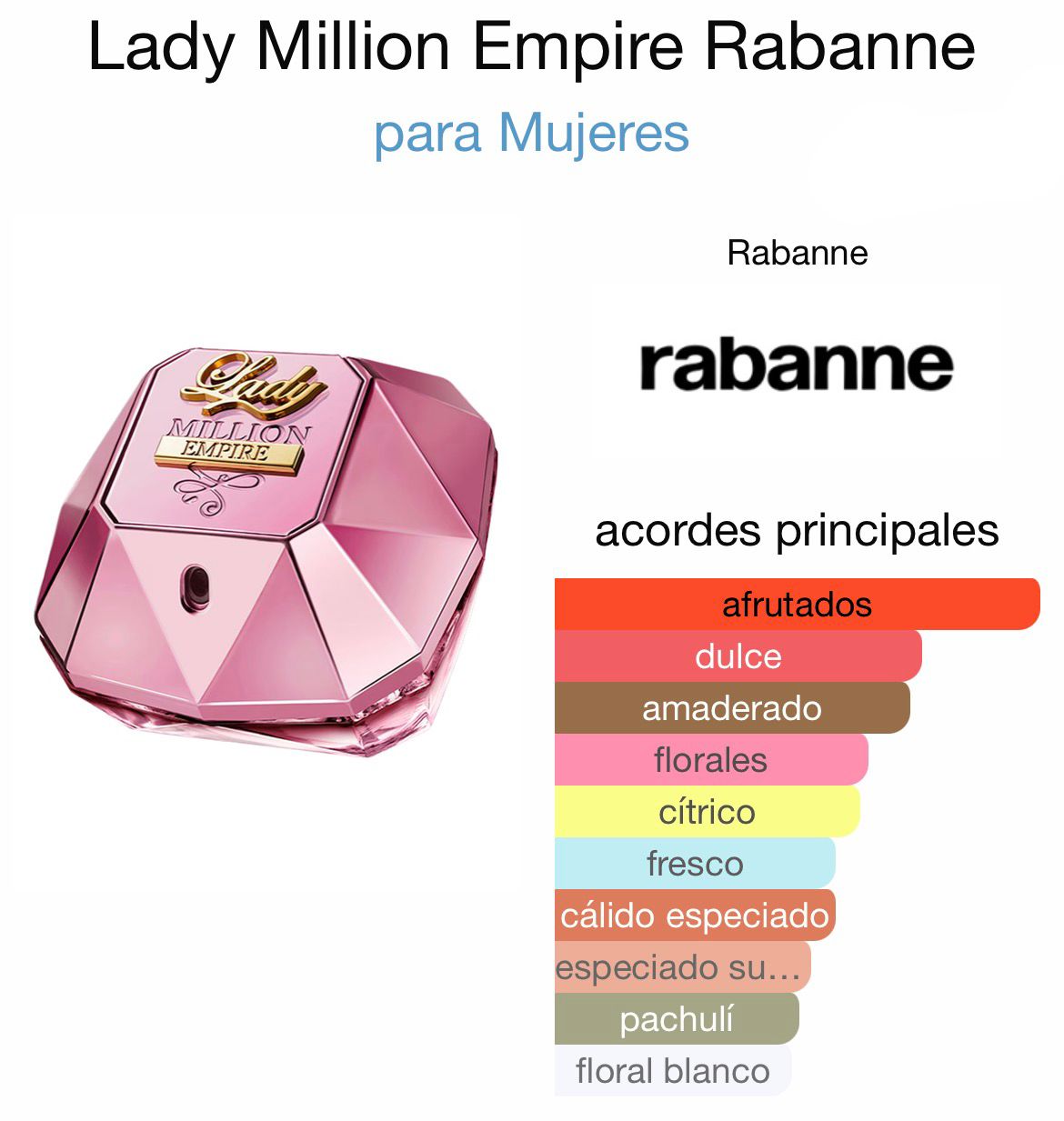 Lady Million Empire de Rabanne es una fragancia de la familia olfativa Chipre Floral para Mujeres. Lady Million Empire se lanzó en 2019. Lady Million Empire fue creada por Anne Flipo y Jean-Christophe Hérault. Las Notas de Salida son grosella roja, naranja y esencia de neroli; las Notas de Corazón son ciruela Mirabel, magnolia, osmanto (olivo oloroso) y flor de azahar del naranjo; las Notas de Fondo son coñac, pachulí y almizcle blanco.