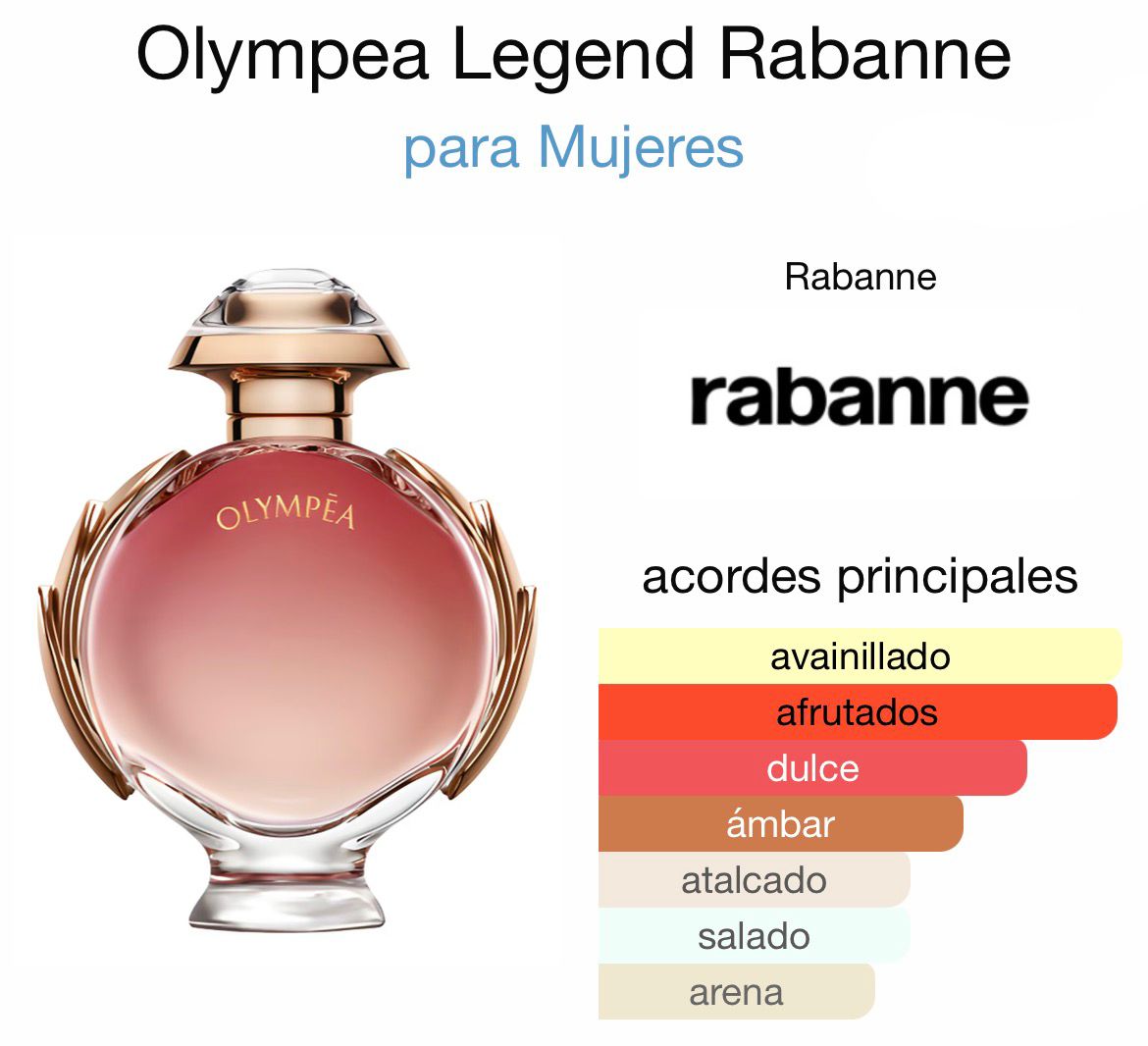 Olympea Legend de Rabanne es una fragancia de la familia olfativa Oriental Floral para Mujeres. Olympea Legend se lanzó en 2019. La Nariz detrás de esta fragrancia es Loc Dong. Las Notas de Salida son ciruela, chabacano y sal de mar; las Notas de Corazón son notas florales y flor de jengibre; las Notas de Fondo son vainilla, haba tonka, ámbar y arena.