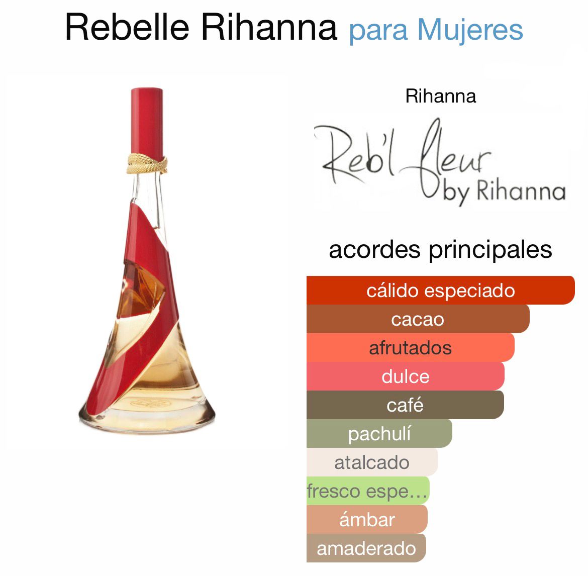 Rebelle de Rihanna es una fragancia de la familia olfativa Floral Frutal Gourmand para Mujeres. Rebelle se lanzó en 2012. Rebelle fue creada por Marypierre Julien y Caroline Sabas. Las Notas de Salida son fresa, jengibre y ciruela; las Notas de Corazón son cacao, orquídea y heliotropo; las Notas de Fondo son café, pachulí, ámbar y almizcle.